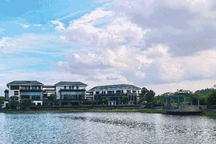 500亩天然湖泊如碧玉镶嵌其中,破晓时分能见晨雾如轻纱笼罩湖面,傍晚能赏落日溶金倾斜于湖面,一叶扁舟轻摇,便可划入湖心,沉浸于水天一色的空濛之中。