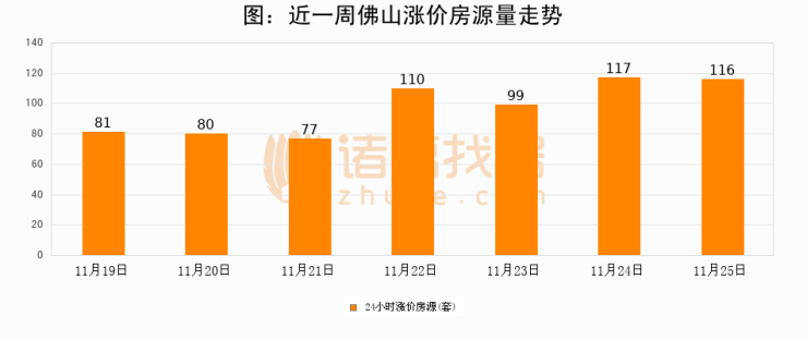 根据诸葛找房数据显示,佛山24小时涨价房源量为116套,较11月24日减少1套,环比下降0.9%。与此同时,涨价房源占比小幅回落,对于购房者来说是一个入市窗口期,购房者可抓住时机入市。