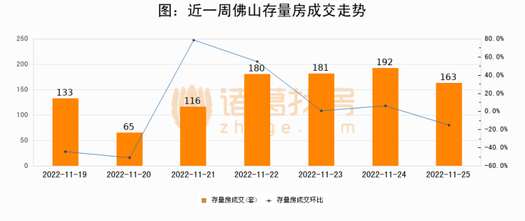 从存量房来看,2022年11月25日佛山存量房单日成交163套,比昨日减少29套,环比下降15.1%。从近一周存量房成交来看,佛山存量房日均成交套数为147套,其中11月24日成交量最高为192套,11月25日单日成交163套,高于近一周平均水平10.9%。