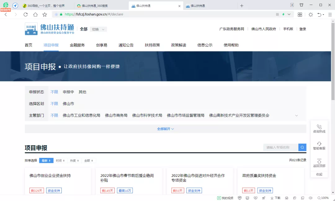 企业进入佛山扶持通主页后,点击“项目申报”,选择“2022年佛山市春节前后援企稳岗补贴”。