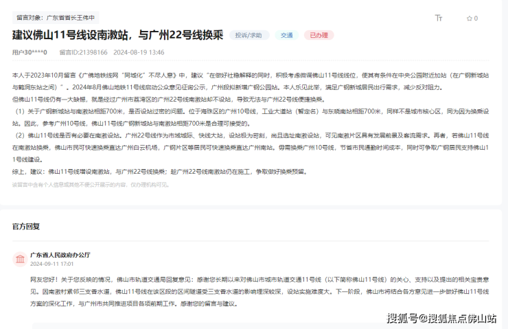 关于是否可以增设南漖站,与广州22号线换乘 ,官方回复为:因南漖村紧邻三支香水道,佛山11号线在该区段的区间隧道受三支香水道的影响埋深较深,设站实施难度大。