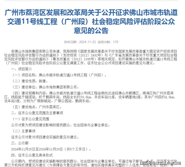11月25日,广州市荔湾区发展和改革局发布关于公开征求佛山市城市轨道交通11号线工程(广州段)社会稳定风险评估阶段公众意见的公告。