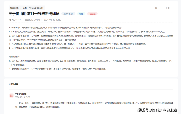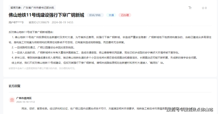 但官方回复言简意赅:经过研究和论证,在广钢公园内设置站点技术可行,方案满足相关环保要求,地铁施工前后会对房屋质量进行检查 。