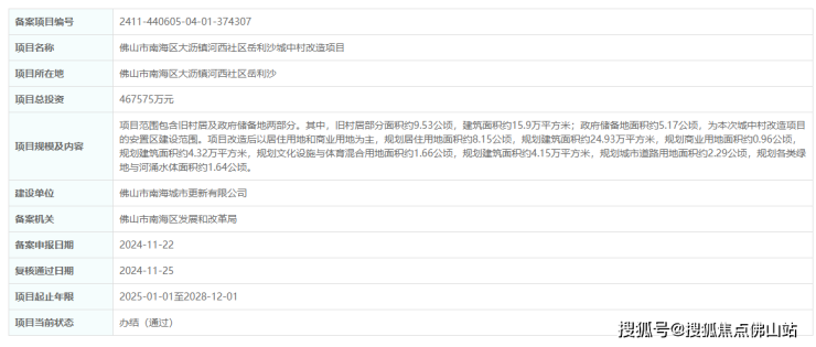 11月25日,广东省投资项目在线审批监管平台审核通过了《佛山市南海区大沥镇河西社区岳利沙城中村改造项目》的备案证明。