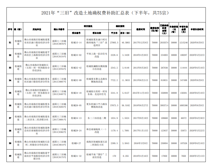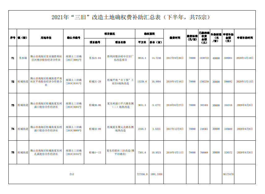 据公告显示,2021年下半年“三旧”改造土地确权费补助汇总的项目总计75个,拟申请补助金额总计36175470元。公示期限:2021年12月13日至2021年12月15日(共三天)。