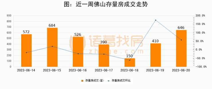 从存量房来看,2023年06月20日佛山存量房单日成交646套,比昨日增加236套,环比上涨57.6%。从近一周存量房成交来看,佛山存量房日均成交套数为482套,06月20日单日成交646套,高于近一周平均水平34%。