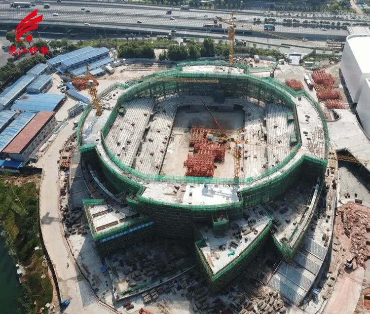 4月10日,南海体育中心二期体育馆项目完成最后一块顶板浇筑,标志着体育馆主体结构顺利封顶。