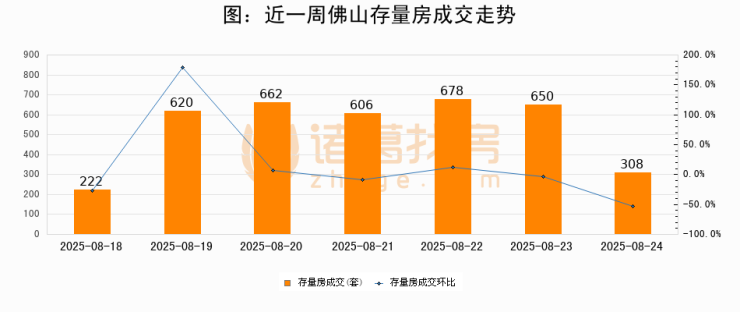 从存量房来看,2025年08月24日佛山存量房单日成交308套,比昨日减少342套,环比下降52.6%。从近一周存量房成交来看,佛山存量房日均成交套数为535套,08月24日单日成交308套,低于近一周平均水平42.4%。