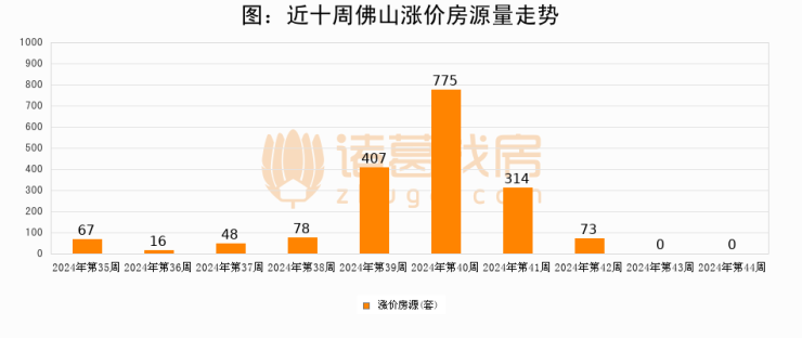 从调价房源来看,第44周佛山涨价房源0套,较上周持平。与此同时,44周涨价房源占比持平
