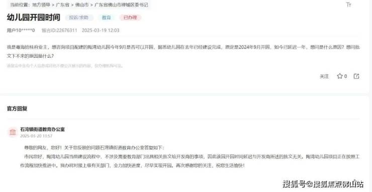 石湾镇街道教育办公室则回复称:“陶湾幼儿园当前建设流程中,不涉及需要教育部门出具相关批文给开发商的事项,因此该园开园时间延迟与开发商所述的批文无关。陶湾幼儿园项目正在按照工作流程加快推进中。我办将对接上级有关部门,全力加快进度,尽早实现开园。”