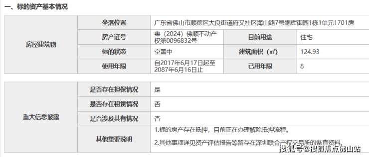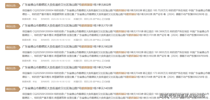 9月16日,深圳联合产权交易所显示,6套顺德大良鹏辉御园的房源被挂出,挂牌金额在173万-191万之间,单价约1.39万/㎡。