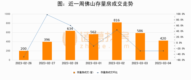 从存量房来看,2023年03月04日佛山存量房单日成交420套,比昨日减少166套,环比下降28.3%。从近一周存量房成交来看,佛山存量房日均成交套数为516套,其中03月02日成交量最高为816套,03月04日单日成交420套,低于近一周平均水平18.6%。