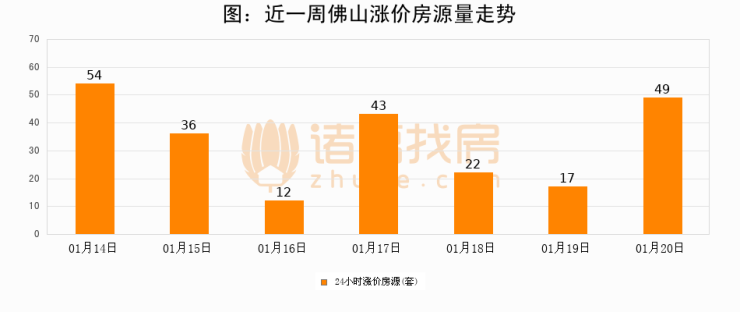 根据诸葛找房数据显示,佛山24小时涨价房源量为49套,较01月19日增加32套,环比上涨188.2%。与此同时,涨价房源占比小幅扩大,业主信心有所提升。