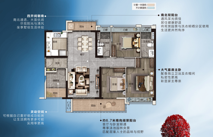 ④、户型够大气,景观阳台6.7米长,连通次卧,四开间朝南,穿堂风十分舒适;