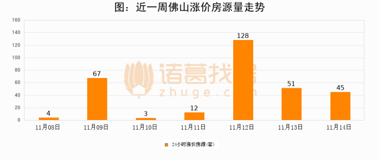根据诸葛找房数据显示,佛山24小时涨价房源量为45套,较11月13日减少6套,环比下降11.8%。与此同时,涨价房源占比小幅回落,对于购房者来说是一个入市窗口期,购房者可抓住时机入市。