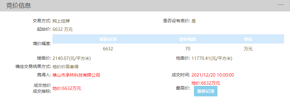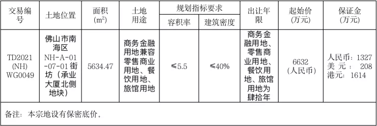 一宗是位于佛山市南海区NH-A-01-07-01街坊(承业大厦北侧地块),由佛山承林科技有限公司以底价6632万元竞得,折合楼面价为2140.07元/㎡。