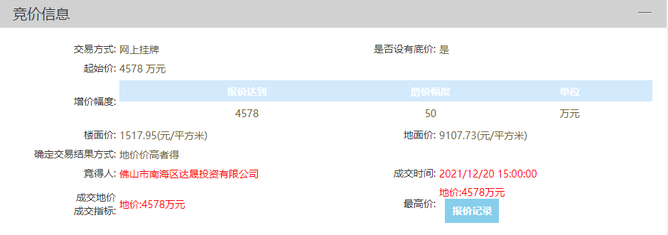 另一宗是位于佛山市南海区桂城街道海六路以南、联达大厦西侧地块,由佛山市南海区达晟投资有限公司以底价4578万元竞得,折合楼面价约1517.95元/㎡。