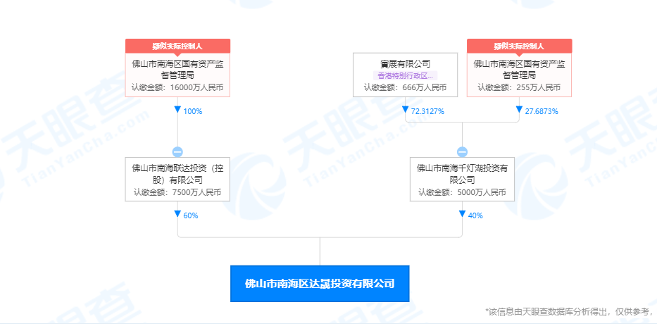 据小编查询天眼查官网信息发现,佛山市南海区达晟投资有限公司的实际控制人为佛山市南海区国有资产监督管理局。