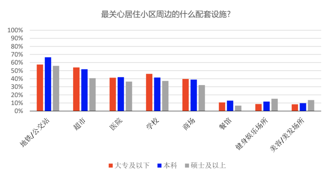 报告显示,无论是何种学历的女性,在购房时最关心居住小区的周边的地铁站、超市、医院、学校、和商场。