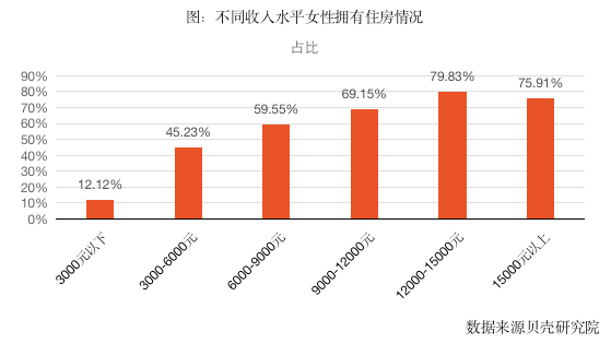 在上述报告中小编特意留意到一点,那就是:月收入在1.2-1.5万的女性拥有住房的占比最多,达到79.53%。