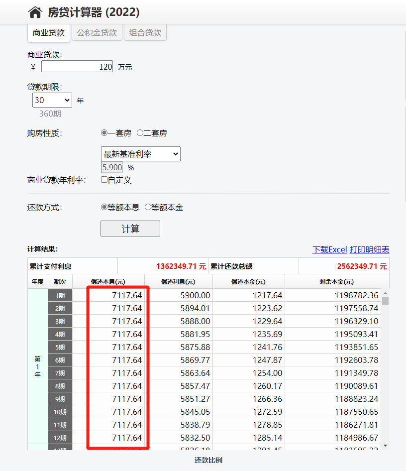 以贷款120万为例,贷款期限30年,等额本息的还款方式每月月供在7117元左右,占了收入的近60%。