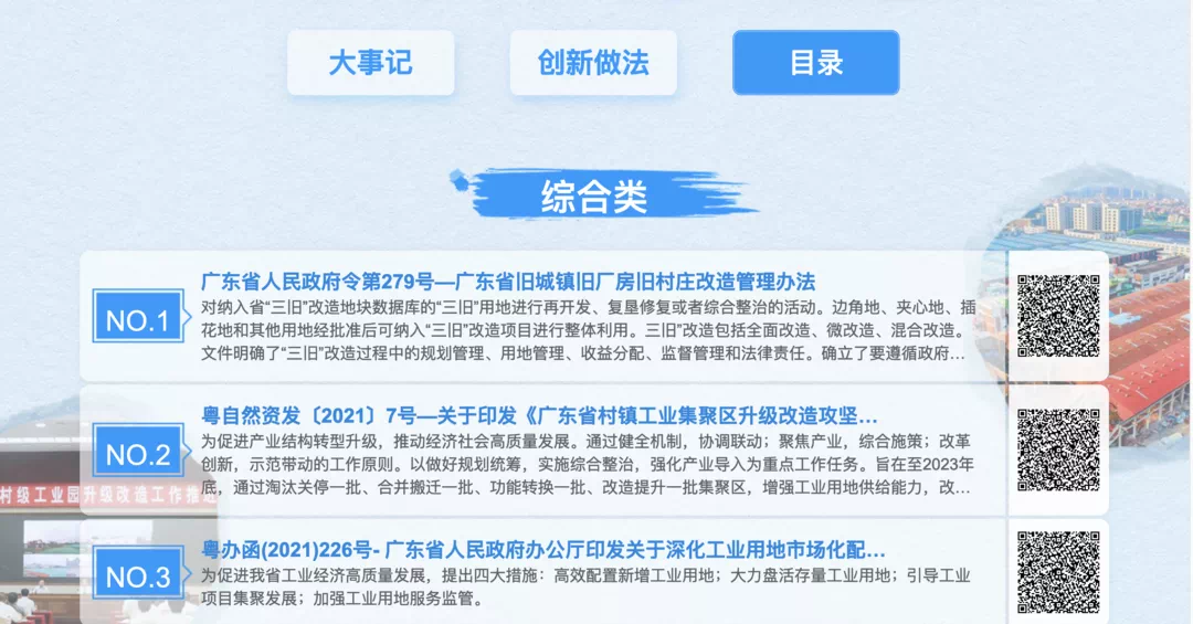 你可以在这里查看省、市、区的村改相关扶持及配套政策,更可按需扫描二维码浏览政策详情。