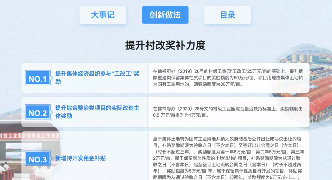 “村改政策”专题按类别区分版块内的展示内容,下设三大板块,分别为“大事记”、“创新做法”、“目录”。