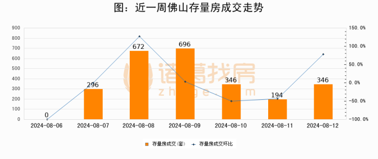 从存量房来看,2024年08月12日佛山存量房单日成交346套,比昨日增加152套,环比上涨78.3%。从近一周存量房成交来看,佛山存量房日均成交套数为364套,08月12日单日成交346套,低于近一周平均水平4.9%。