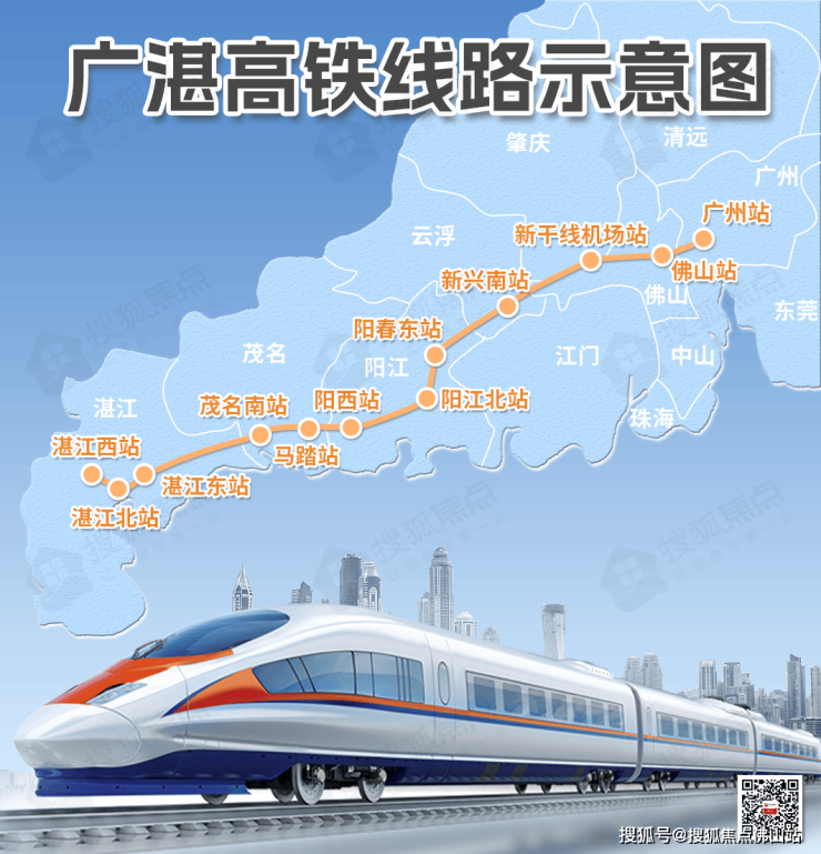 广湛高铁全线401公里,时速可达350公里,线路始于广州,途经佛山、肇庆、云浮、阳江、茂名、湛江等市。