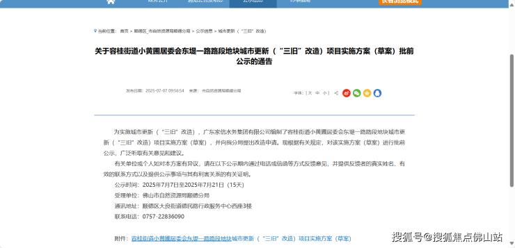 7月7日,佛山市自然资源局顺德分局发布《关于容桂街道小黄圃居委会东堤一路路段地块城市更新(“三旧”改造)项目实施方案(草案)批前公示的通告》。