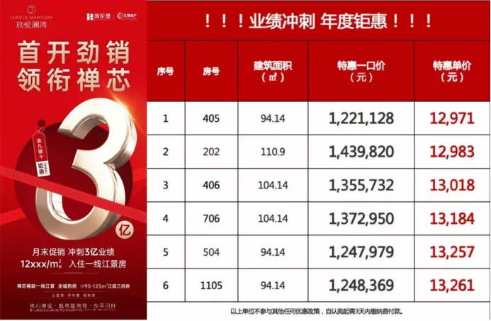 四个月前,在该盘刚入市的时候,可谓底气十足喊出1.8万/㎡吹风价,同期隔壁项目美X凤翔湾X在售均价也仅1.7万/㎡。抵不住业绩压力和楼市惯性滑行期,两盘房价已经前仆后继“内卷”起来。除了特价房源,目前海X玖X在售的2座产品,均价也就1.3万/㎡左右,整体下调超3000元/㎡。美X凤翔湾X则推出清栋优惠,价格与隔壁好兄弟相差不大。