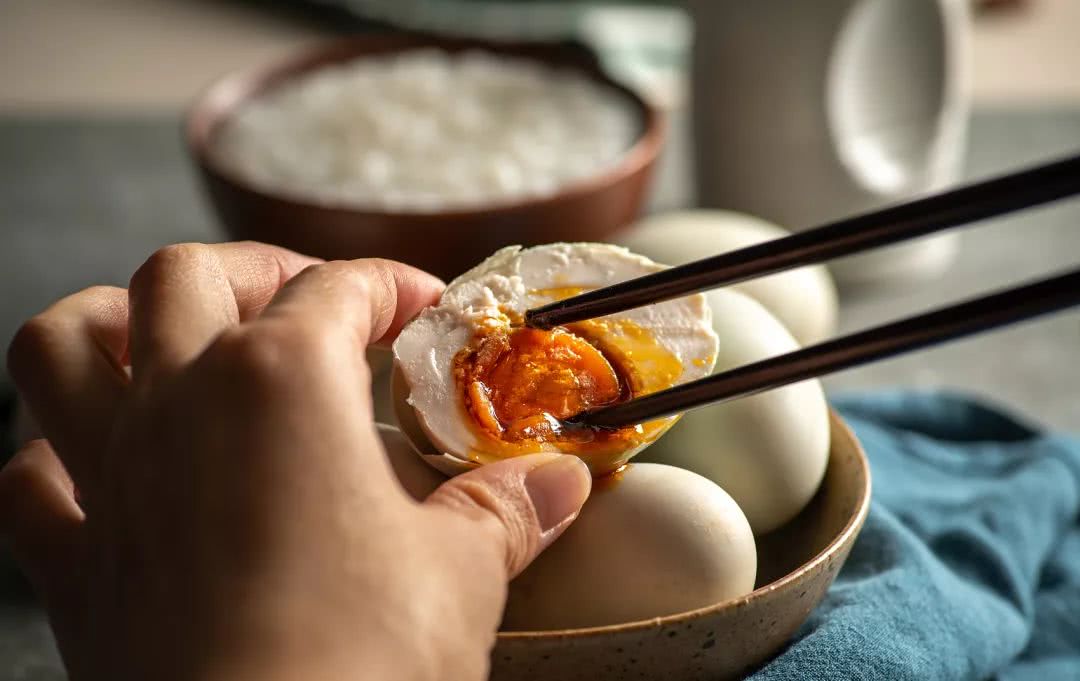 一碗白粥配上冒着红油的咸鸭蛋