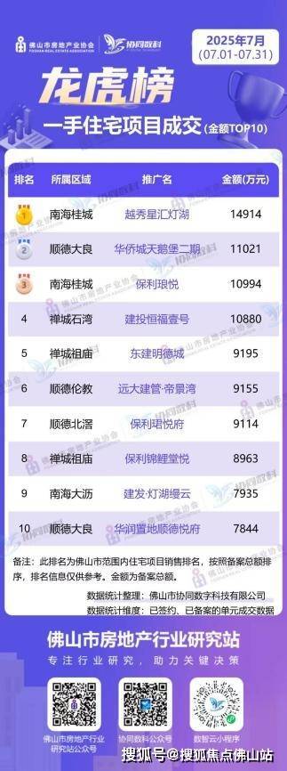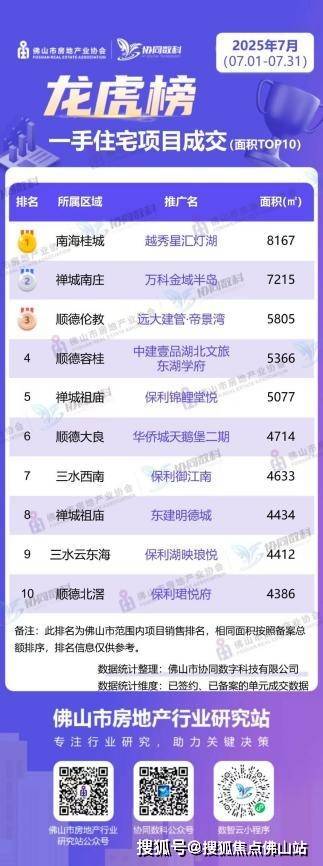 根据佛山市房地产行业研究站发布的2025年7月住宅龙虎榜,千灯湖板块的新规项目——越秀星汇灯湖以成交套数83套、成交面积8167平方米、成交金额14914万元夺得套数榜、面积、金额榜榜首!霸榜佛山市,「三冠王」实至名归!