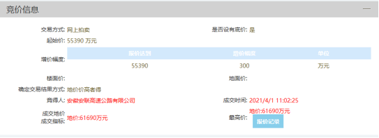 据悉,该项目于2021年4月1日由安徽安联高速公路有限公司以总价61690万元斩获,折合成交楼面价约4455元/㎡。