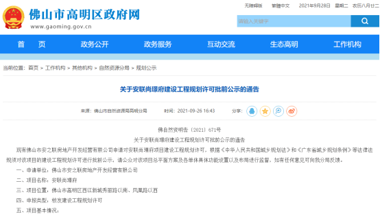 近日,佛山市自然资源局高明分局发布了《关于安联尚璟府建设工程规划许可批前公示的通告》,这意味着安联高明西江新城项目规划出炉,备案名为安联尚璟府。