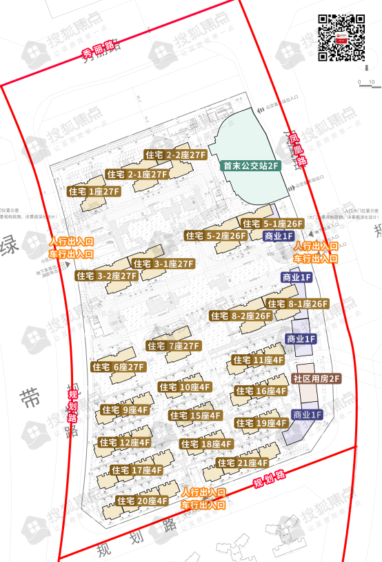 项目由22栋住宅+4处商业+1处社区用房+1处公交首末站组成,其中商业和社区用房位于项目东南侧、公交首末站位于东北侧。