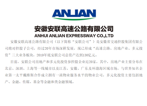 小狐翻查资料获悉,安徽安联高速公路有限公司是安徽省交通控股集团有限公司特别控股子公司,经过20年市场深耕发展,现已形成“高速公路、房地产业、多元投资”三大业务板块,2019年底安联公司总资产达到130亿元。
