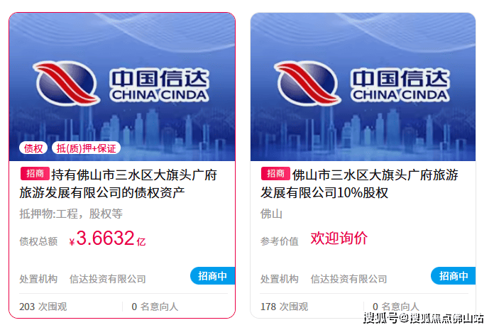 阿里资产交易平台显示,三水大旗头广府旅游发展有限公司的两宗债权正在招商。