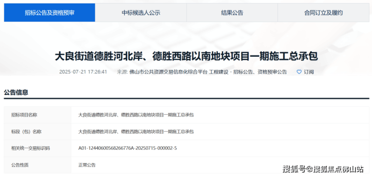 近日,广东省公共资源交易平台发布大良街道德胜河北岸、德胜西路以南地块项目一期施工总承包招标公告。