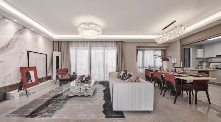 其中约122㎡的四房户型,客厅、阳台、主卧、次卧实现四开间朝南,餐厅+客厅的南向采光面达到了约6.7米,再加上南北阔景双阳台的设计,不仅实现了家庭公区的较大化,空间阔绰得可与140平以上的产品相媲美,大宅气场表现得酣畅淋漓。