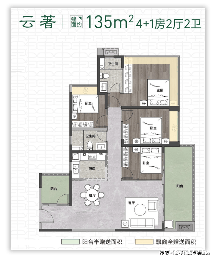 最大的135㎡4+1户型,四开间朝南,采光面近14米,三个卧室位于一列,主卧带270°巨幕观景落地窗,空间使用率很高。