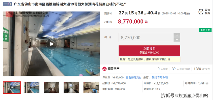近日,位于南海西樵的恒大御湖湾小区会所登上阿里法拍平台,起拍价为877万,将于10月8日进行法拍。