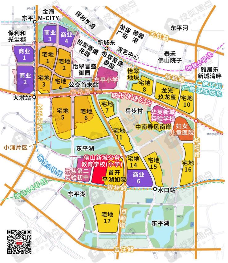 从区位图来看,项目位属佛山新城片区,周边有佛山新城义务教育学校(小学)、华英新城实验学校、地铁3号线、14号线、妇女儿童医院、东平湖等设施配套。
