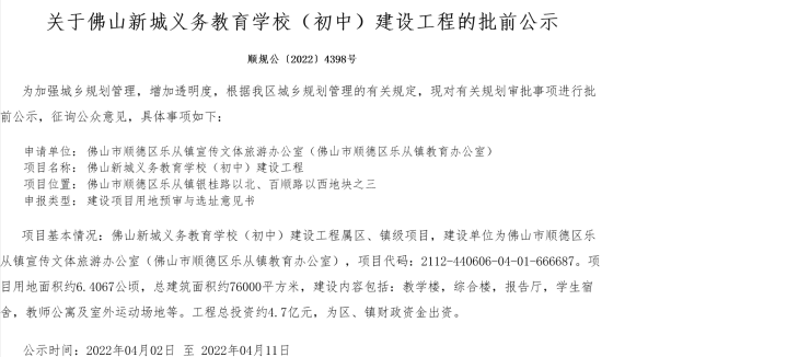 4月2日,搜狐焦点佛山站从佛山市资源自然局顺德分局获悉,佛山新城义务教育学校(初中)建设工程进行批前公示,即乐从第二实验中学,预计4月11日结束。