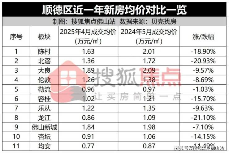 北滘、龙江的跌幅则超过20%,最大达21.1%,跌了近2100元/㎡。