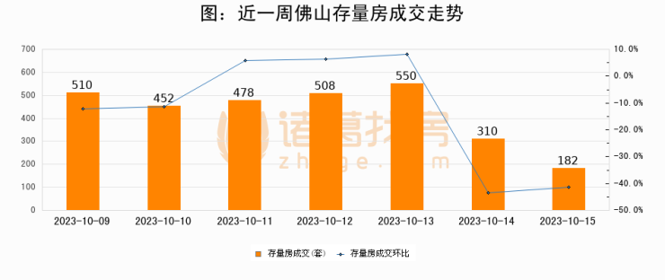 从存量房来看,2023年10月15日佛山存量房单日成交182套,比昨日减少128套,环比下降41.3%。从近一周存量房成交来看,佛山存量房日均成交套数为427套,10月15日单日成交182套,低于近一周平均水平57.4%。