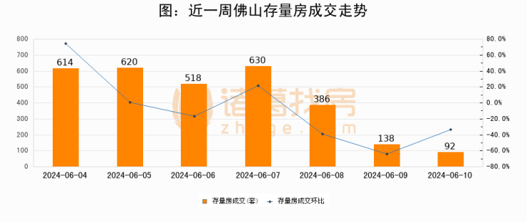 从存量房来看,2024年06月10日佛山存量房单日成交92套,比昨日减少46套,环比下降33.3%。从近一周存量房成交来看,佛山存量房日均成交套数为428套,06月10日单日成交92套,低于近一周平均水平78.5%。