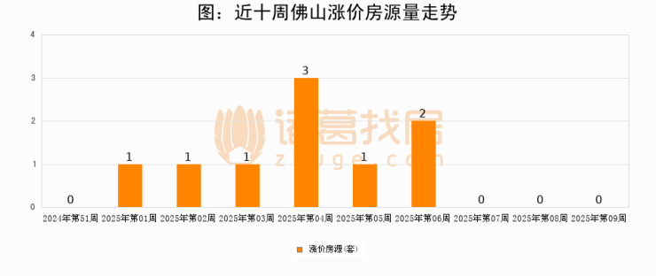 从调价房源来看,第9周佛山涨价房源0套,较上周持平。与此同时,9周涨价房源占比持平
