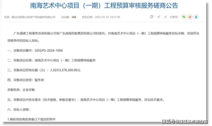 1月7日,南海艺术中心项目(一期)工程预算审核服务磋商公告发布。