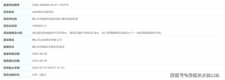 建设单位为佛山市金铂商业有限公司,总投资10亿元,项目起止年限为2025年7月1日至2027年1月1日。